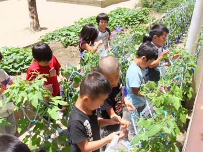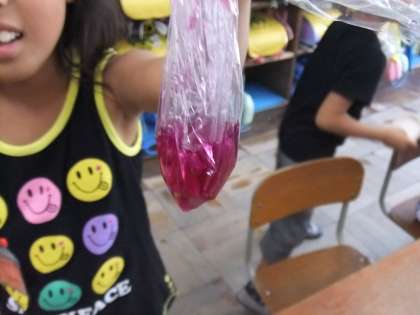 自分のあさがおから花を摘んできて,袋に入れて水を加えます。子どもたちは,袋を一生懸命もみもみして,水に色がついていくのを楽しんでいました。子どもたちからは…