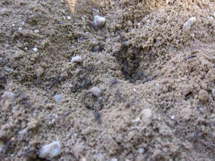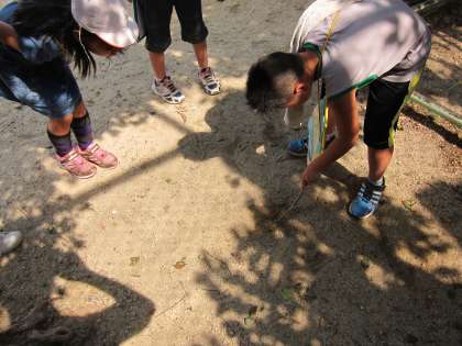 いろいろ探しながら歩いていると…何かの大群を見つけました。ありです。いつも見るよりも数が多かったので,子ども達は驚いていました。ありは運動場にいるのですが,いつもはこうやって地面を見ながら歩くことがないので,なかなか気がつかなかったのでしょう。運動場で,ボール遊びをしていると気がつかないことも,こうして地面を見ながら歩いていると気がつくこともあるのですね。