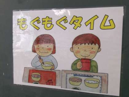1ねんせいのみんなは,給食をお残ししないよう全部食べきることをがんばっています!以前,栄養教諭から給食指導があったときに『もぐもぐタイム』というカードが出てきました。この『もぐもぐタイム』カードが出てくると,子どもたちは8分間,食べものの味をあじわうため,無言で給食を楽しみルールがあります。