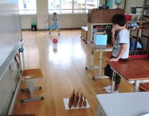 休み時間,今はボーリングに夢中です。ローテションで役割を分担し