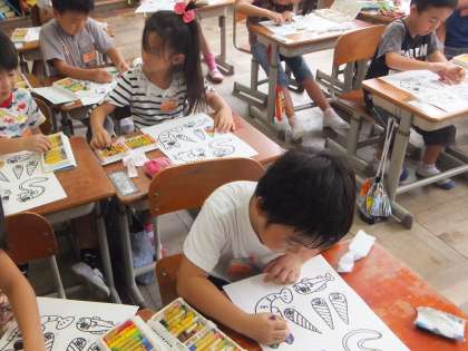 図工では,「みんな あつまれ」の活動をしています。みんなと言っても,人ではなく魚や海の仲間たちなのですが,子どもたちは楽しそうに自分の好きな色を使って,パスでステキな魚や貝を作る取り組みをしています。