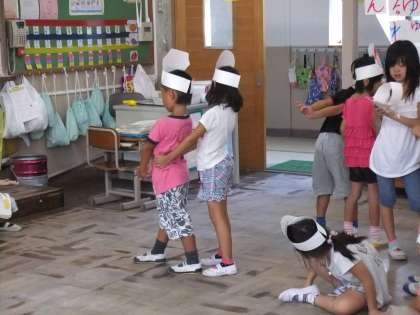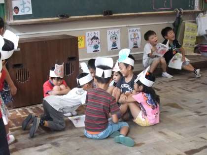 1ねんせいの物語文「おおきな かぶ」では,読むことの大切さを学ぶために,おおきなかぶの劇をします。みんなが何かの役になって,その人物たちの気持ちを考えて,言葉を言ったり,行動したりします☆写真は,どうしようか話し合ったり,やってみたりしているところです。