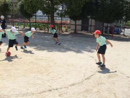 1ねんせいのたいいくでは,「ころがし どっじ」をしています。