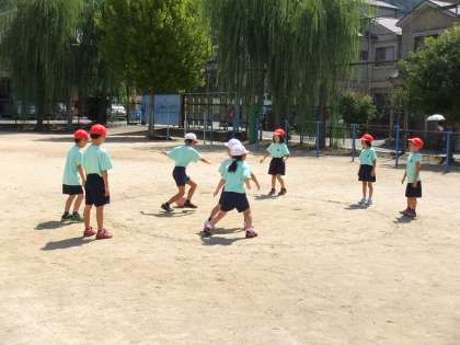 円や四角のコートの中にいる相手に対して,ボールを上手に転がして当てます。どうしたら上手に当てられるようになるのか,クラスやチームで相談しながら,ゲームをしていきます。歓声をあげて楽しんでいます♪