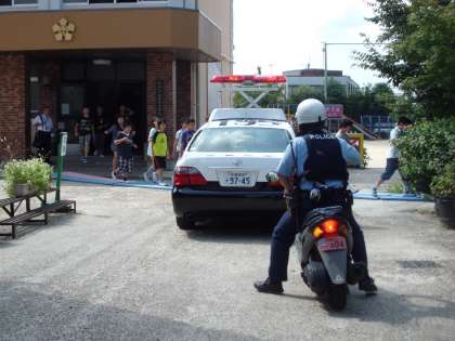 本日不審者侵入による避難訓練を実施しました。山科警察の警察官が不審者になり、侵入して刃物を見せるという想定でした。教職員が対応し、警察官がやってきて確保しました。あってはならないことですが、万一のための訓練です。みんな真剣でした。