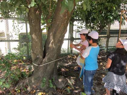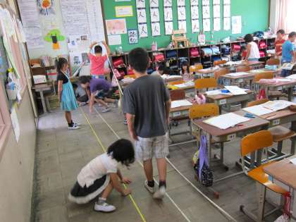 今日は,まきじゃくを使って色んな物の長さをはかってみました。教室の縦・横の長さ,運動場にある木のまわりをみんなではかりました。学校のまきじゃくは,「0」よりも少ないところから目盛りが始まっているので,「0」に合わせるのが難しそうでした。また,木の周りをはかる際に,どこの部分を読めばいいのか,考えながら学習していました。班で自由にはかる時間も取りましたが,廊下や鉄棒の高さ,先生の身長をはかっている班もありました。