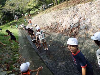 川遊びでは、ビニール袋に水を入れてかけあいっこをして、熱くなった体をクールダウンしていました。