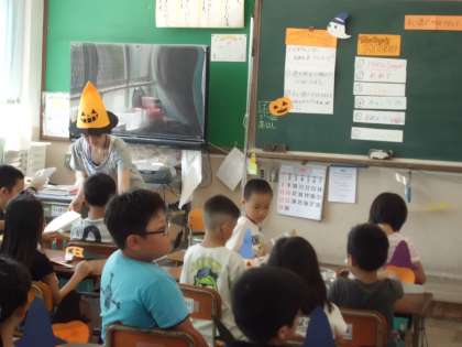 「ハロインパーティのお面をつくろう」というテーマで英語活動の授業をしました。