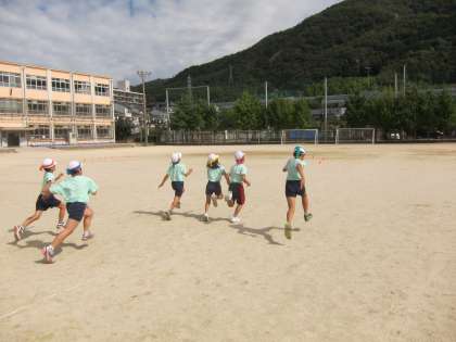 3年生,もう一つの競技は80m走です。去年よりも少し距離が延びました。その分,体力が必要です。やはり50mを過ぎたあたりから,スピードダウンしている子がちらほら…最後までしっかり,腕を振って走りきる体力をつけるために,これから頑張りましょう!