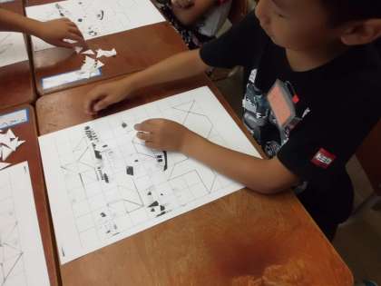 先日の形づくりに続いて,三角の紙で絵に合った形を作っていきました。今回は,前回のように三角の形に色がついていないので,どこに三角を当てはめるかが難しいようです。友だちと協力しながら,絵に合った形をきちんと作っていくことができました☆