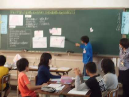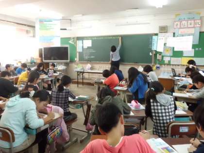 5年生の授業を公開し、研究を進めました。この時間のねらいは台形の面積を、既習事項もとに考えることでした。気づきや見通しを相談した後、グループで話し合いました。いろいろ考え発表していました。
