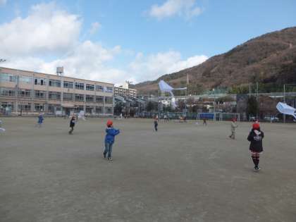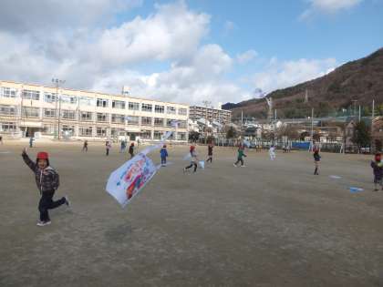 生活科では,「むかしのあそび」をしています。冬になると「けん玉」をはりきって取り組んできましたが,今回は『凧上げ』です。図工で作った凧を,大空にあげました!