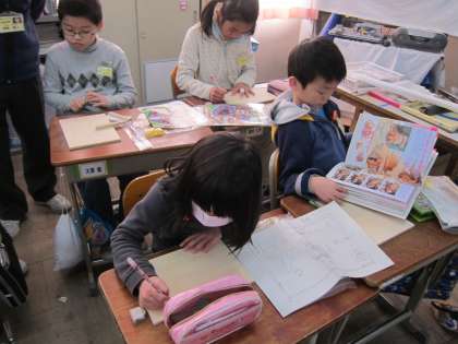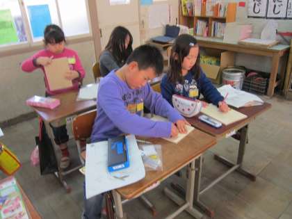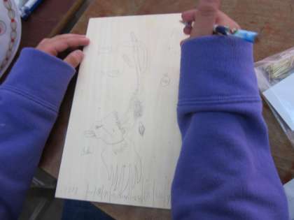 コリントゲームの作成は,木の板に絵を描いていく作業に入りました。今回は,ビー玉をはじいて遊ぶゲームなので,ボールが飛んでいくような様子を連想し,デザインしている子が沢山いました。絵が完成したら釘打ちです。完成して,遊ぶのが楽しみですね。