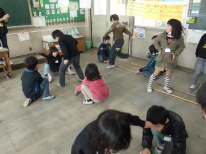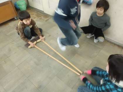 リズムはとれるのですが,足元の竹に気を取られてひっかかってしまう子がいました。