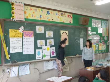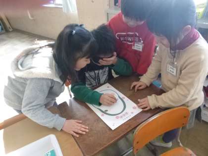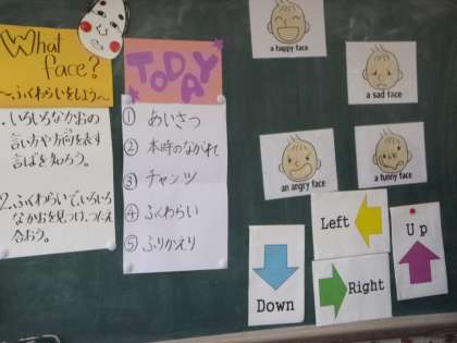 2年生の英語活動で「ふくわらい」をしました。up down left right の言い方に慣れて目や口を動かしました。橘大学の学生が英語の補助をしてくれました。