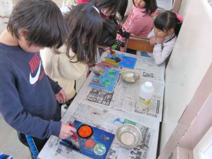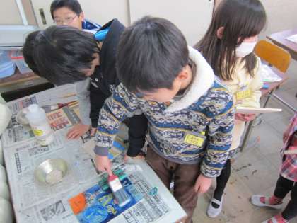 コリントゲームの絵も仕上がり,ニス塗りに入りました。独特の匂いで,塗るのに戸惑っていましたが,仕上がりはピカピカで奇麗になりました。次は,いよいよ釘を打っていきます。