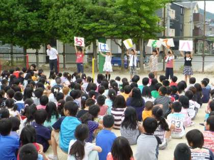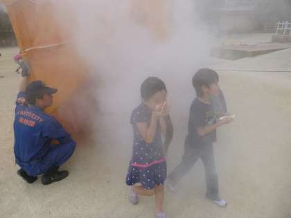 を全校児童で確認しました。1・3・5年生は煙ハウスを体験しました。