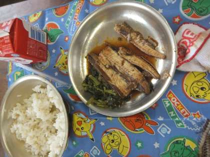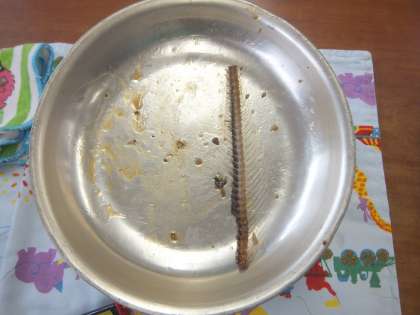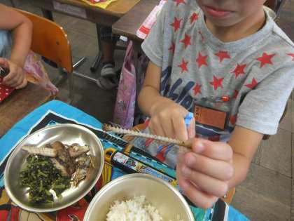 まず,お箸で魚の真ん中に切れ目を入れます。
