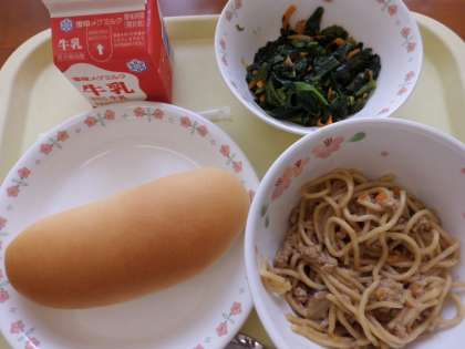 新献立の担々麺,ほうれん草のいためもの,小型コッペパン,牛乳でした。