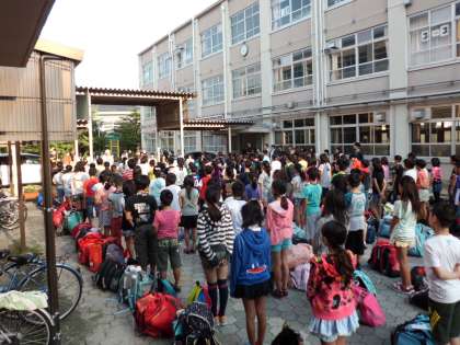 学校での出発式の様子です。めあてに向かって,友達とともに楽しく宿泊学習をしてきます。