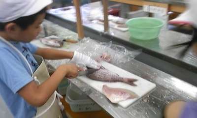 広々としたところでつりをしました。つった魚は自分でさばき,料理しました。