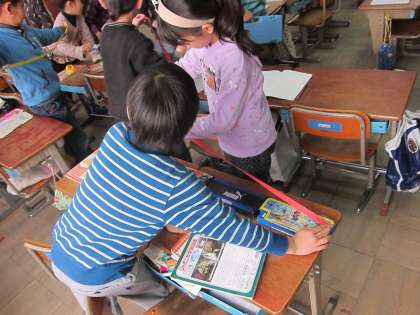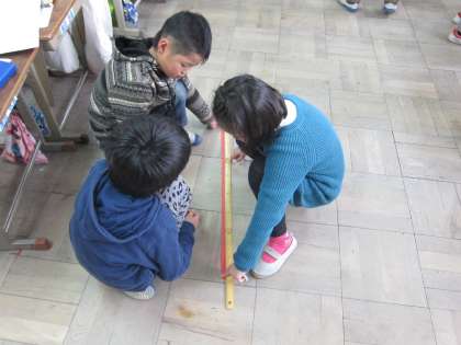 今回はテープで1mと思うところを予想して切るという学習をしました。1mはどれくらいでしょう。「オルガンの横くらい」「鍵盤ハーモニカ3つ分」と子ども達はいろいろな予想を立てていました。一番1mに近い子は1cm以内という誤差でした。