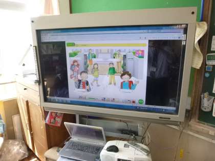 5年生児童が英語を楽しそうに話していました。大宅中学校の先生もいっしょに学習しました。