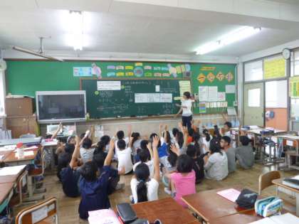 算数科の授業を低中高の部会に分かれて実施しました。子ども達は気づいたことを進んで話していました。また「めあて」も自分たちでつくろうという気持ちがよく出ていました。6年ではグループ学習の後の集団解決場面で、比較・類推などの意見が出ていました。