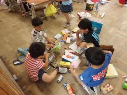 算数の「いろいろなかたち」の学習で使った箱を組み合わせて,いろいろなものを作りました。四角い箱を組み合わせてロボットを作ったり,動物や車を作ったり,友達と一緒に楽しそうにお話ししながら工作していました♪