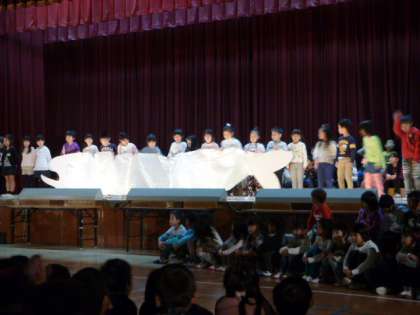 ●1年『みんななかよし〜くじらぐもにのって〜』・・・くじらぐもに乗って世界中に出かけるお話でした。各国の歌や踊りで世界を表現できました。一生懸命な演技がとてもかわいかったです。
