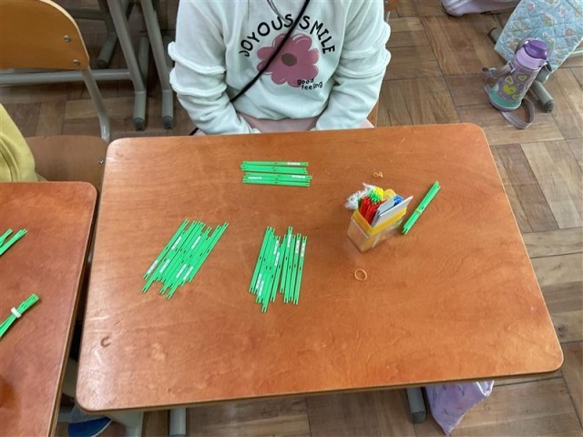 数え棒やお金の模型を使いながら、どのように大きい数を表すことができるか一生懸命考える姿が見られました。