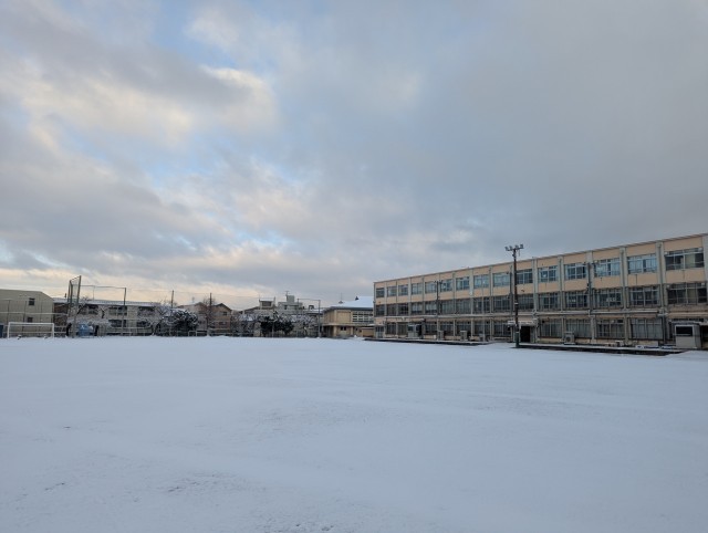 おはようございます。学校は一面の銀世界です。通学路は凍っていて滑りやすくなっています。大変危険です。ゆっくり、走らずに、雪に気をとられてケガなどしないように気をつけて来てくださいね。