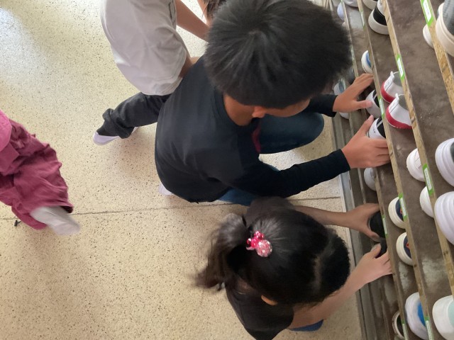 6年生のお兄さん・お姉さんが優しくそうじの仕方を教えてくれています。