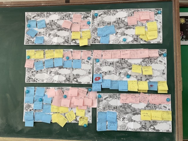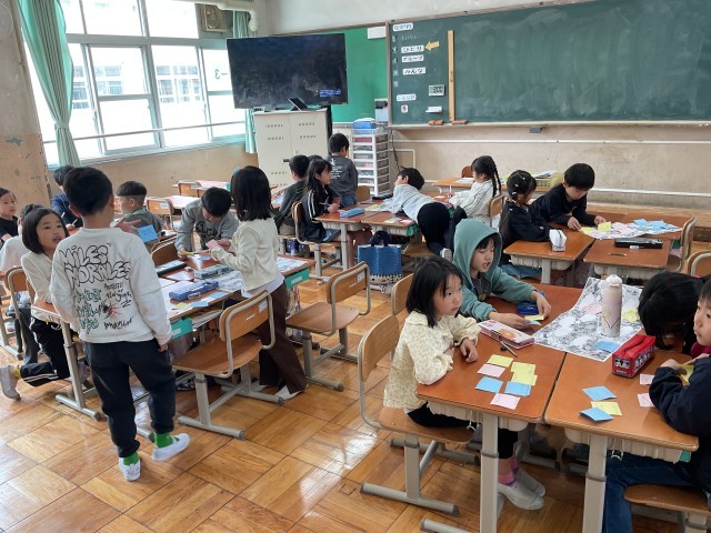 生活科「わたしのせいかつマップ」の学習で、生活の中で気づいたことや見つけたことを付箋に貼って整理しました。「家」「学校」「町」の3つに分けながら、1人で考えたことをグループで交流しました。これからもたくさん発見できると素敵ですね!