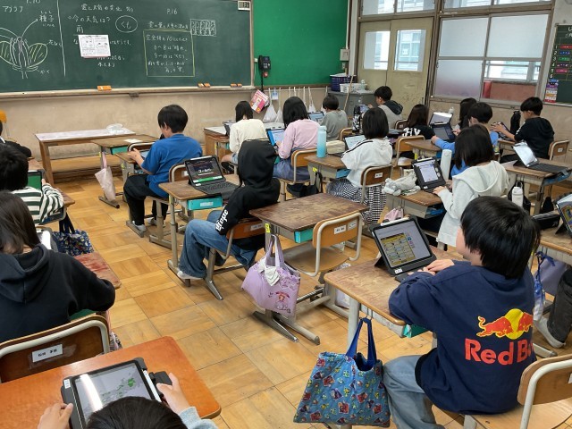 タブレットを使って学習する時間には、静かに一生懸命に画面に向かっています。