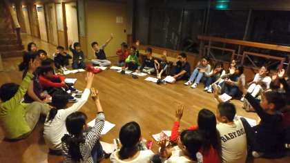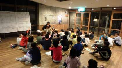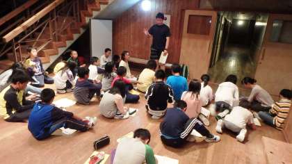 宿泊棟には,ミーティングができるような広いスペースが3か所もあります。それぞれクラスごとに分かれて1日のふりかえりを行いました。うまくいったこと,うまくいかなかったこと,1日目にしてたくさんの成果と課題が見えてきました。「楽しむだけではない。これは学習なのだ。」ということは,誰もが頭ではわかっていることなのですが…。