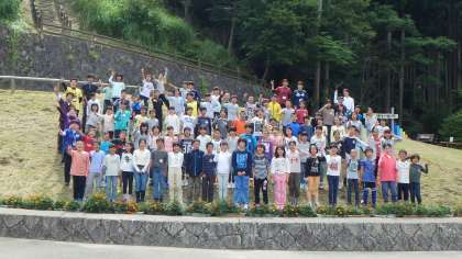 滝谷山登山の前に,芝生広場で記念撮影をしました。子どもたちは元気いっぱいです。長ズボンに長袖,ズボンの裾は靴下にイン!虫対策もバッチリです♪ケガなく帰ってきてね♪
