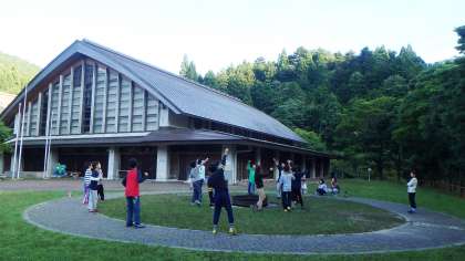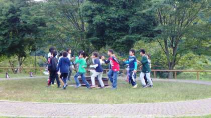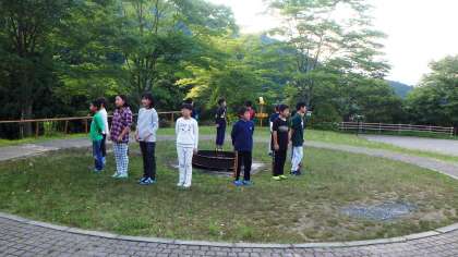 夕食後,数人の子どもたちが外へ出ていくので…ついて行ってみると…何と営火場で明日のキャンプファイヤーのリハーサルをしているではありませんか!子どもたちはレクリェーション係です。キャンプファイヤーは,野外活動の中でも最も盛り上がる活動だと言っても過言ではありません。その進行を任されているのですから,大きなプレッシャーがあるはずです。でも,子どもたちの練習する一生懸命な姿を見ていると安心しました。みんなの笑顔のために,自分たちがとびっきりの笑顔を見せて楽しんでいるからです。彼らならば,きっと盛り上げてくれるに違いない!
