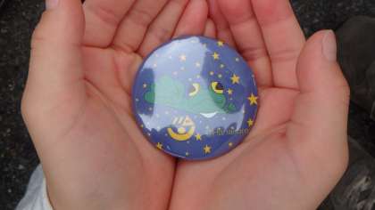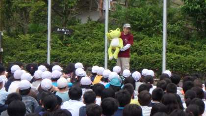 今朝は,花脊山の家に同時期に入所している上鳥羽小学校,修学院第二小学校,第四錦林小学校の5年生たちと合同で朝の集いを行いました。4校合同であっても5分前に全員が集合できました。初めに,山の家の職員さんがパペットを使いながら山の家の紹介をしてくださいました。ご存知でしょうか?山の家のマスコットキャラクター「ハナコロちゃん」です。このキャラクターは,山の家付近に生息するシュレーゲルアオガエルがモデルで,山の家20周年を記念して職員さんがデザインされたものだそうです。本日,幸運にも誕生日をむかえた子どもと学校紹介をした5人のリーダーたちに,ハナコロバッジをプレゼントしていただきました♪