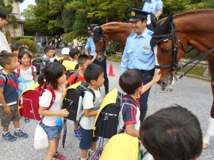 京都府警の平安騎馬隊が安全指導をしに,嵯峨小学校まで来てくださりました。