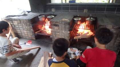 野外炊事2回目の子どもたちは,とっても手際がよく,調理班はもちろんですが,火の係もスムーズにかまどを作り,火加減まで調節していました。できあがりが楽しみです♪