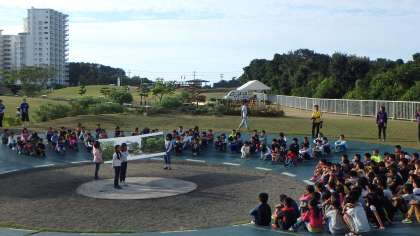 朝の集いが安井小学校と合同で行われました。両校とも「5分前行動」をこえる8分前行動ができていたので,予定よりもはやく開始することができました。校歌にあわせて旗を掲揚し,学校紹介では大型プリンターで印刷した歴史ある嵯峨小学校の本館を見せながら学校自慢をしました。まずは「あいさつ」で声をかけるところからはじめて,なかよくしてほしいと思います。