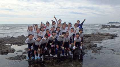 クラスごとに記念撮影をしました。少し雲が多くなってきて,波しぶきも立っていますが,予定通り磯観察を行いました。