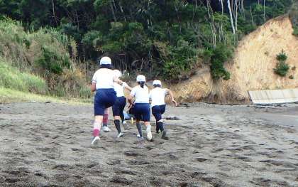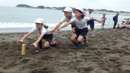 浜でのもうひとつのお楽しみは,ビーチフラッグ!文字通りビーチでしかできない活動です。思った以上に走りにくい砂浜,瞬発力と判断力が勝敗を分けます。勝ち進んでいったメンバーの戦いは,タッチの差で明暗が決まるので,たいへん見ごたえがありました。今日は,砂まみれになっても怒られないので,転がったり,とび込んだりとみんな砂の感触を存分に味わっているようでした。