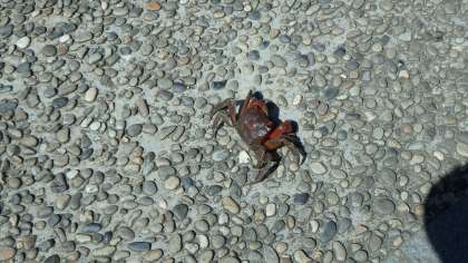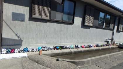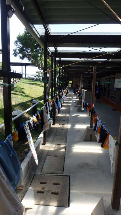 プールが終わり,海で使った靴と水着が洗って干されています。このお天気だとスッキリ乾きそうです。ふと足元を見ると…出ました!カニです。みさきの家に生息するカニが水を求めてやってきたのでしょうか?あっそういえば,さっきプールの中にもカニがいたようで,気づいた子どもが帽子ですくって池に逃がしてくれていました。さすが,自然に囲まれた場所ですね。