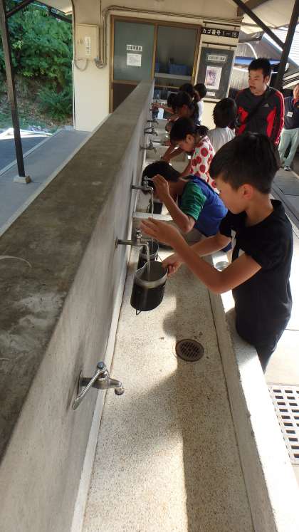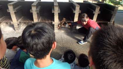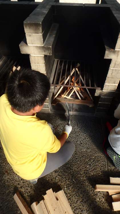 ボランティアさんから教わった薪の組み方を真似て,火の係が火起こしにチャレンジ!一方,お米係は,米をといで水加減を調整!役割を分担しながら,初体験の野外炊事に挑みました。おいしいごはんが焚けるでしょうか?