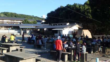 野外炊事場のすぐそばには深谷水道が流れています。太平洋と英虞湾とをつないでいる運河なので,行きかう船を見ることができます。今日は,そんなロケーションのいい場所で夕食をいただきます。