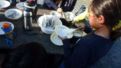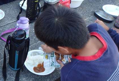 まずは,飯盒で炊いたごはんをお皿に盛りつけ,かまどで湯煎したレトルトカレーを注ぎます。あちこちのテーブルからいい香りが漂ってきます。後は,いただきますを待つだけです。
