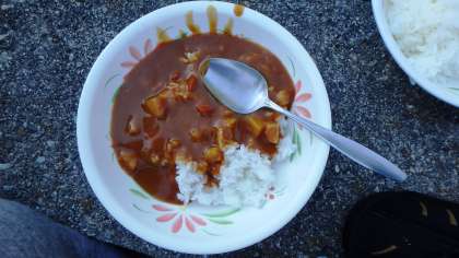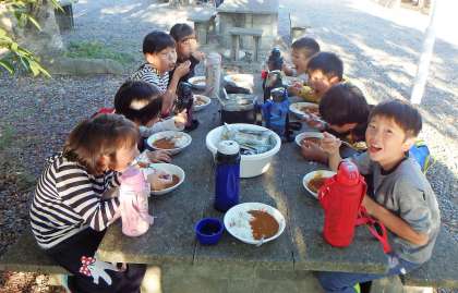 食事係のかけ声とともに,一斉にカレーをほおばる子どもたち。「おいしい♪」「おこげが入っている♪」どの班も上手にごはんが炊けました。飯盒で炊くと家庭の炊飯器とはひと味ちがったできあがりになるから不思議です。ごちそうさまでした♪