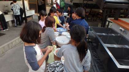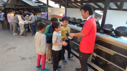野外炊事の後には,片付けが待っています。いつも食事を作り,後片付けもしてくださっているお家の方の大変さを感じながら,子どもたちも分担して一生懸命励んでいました。ここでも「来た時よりも美しく」です。使う前よりもきれいな状態にして返さなければなりません。飯盒についたご飯粒,外側の黒いすすは何度こすってもなかなかとれません。お皿とスプーンはヌルヌルしていませんか?先生たちのきびしいチェックをクリアするために最後まで丁寧に取り組んでいました。